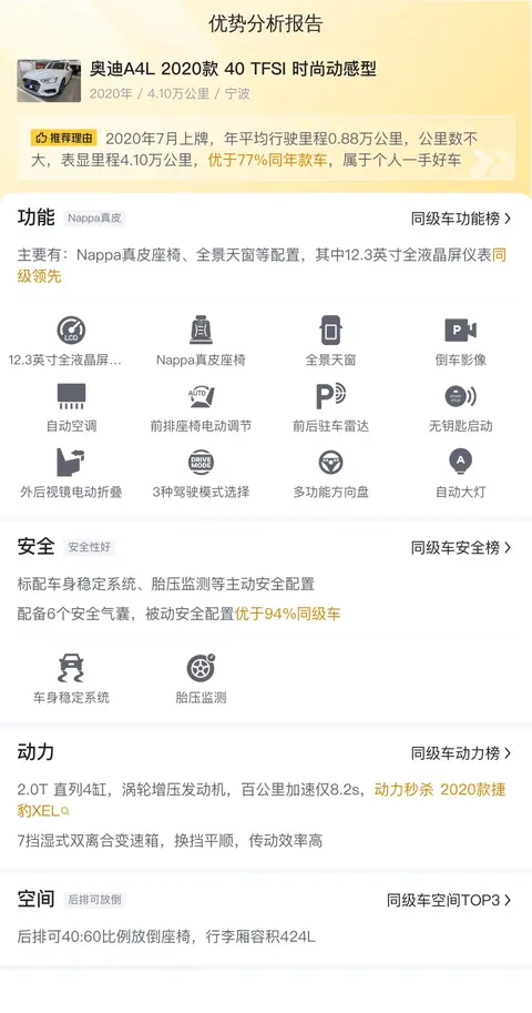 根据懂车帝平台的数据,这款奥迪A4L 2020款 40 TFSI 时尚动感型的二手车报价为10.68万元。该车的车源地为宁波,上牌地也是宁波,上牌日期为2020年7月,表显里程为4.1万公里,车身颜色为白色,过户次数为0次。在排放标准方面,该车符合国VI标准。此外,该车还配备了全景天窗、真皮座椅、全液晶仪表盘以及定速巡航等功能。