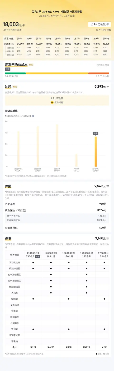 关于宝马7系的用车成本,我们为您收集了一些数据,供您参考。首先,这款车的百公里油耗大约为6.4升,按此计算,每年的油费大约为13714元(假设每年行驶2万公里)。其次,保险费用也是用车成本的重要组成部分,预计每年约为11688元。此外,车辆保养也是必不可少的,预计每年将花费约4108元。综上所述,宝马7系的年均使用成本大约为29510元。需要注意的是,实际费用可能会因个人驾驶习惯、地区差异等因素而有所变动。