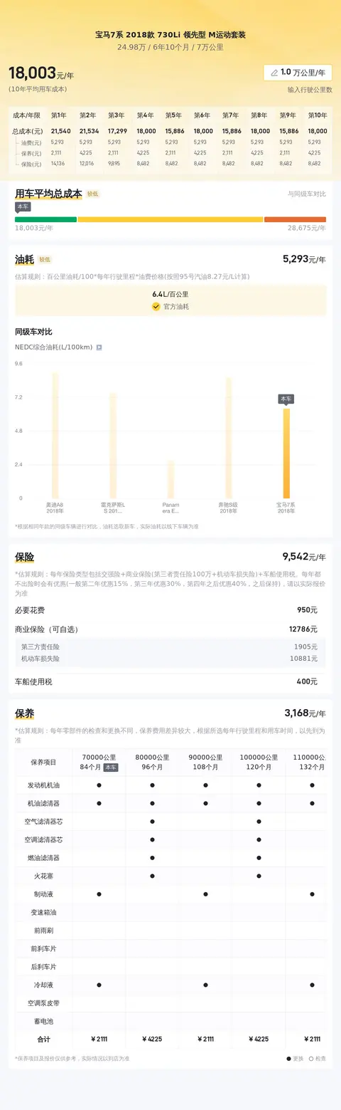 据估算,宝马7系 2018款 730Li 领先型 M运动套装的用车成本较低,因为同级车的最低用车成本是17988元/年,最高是40241元/年,而宝马7系 2018款 730Li 领先型 M运动套装是17988元/年,所以较低。