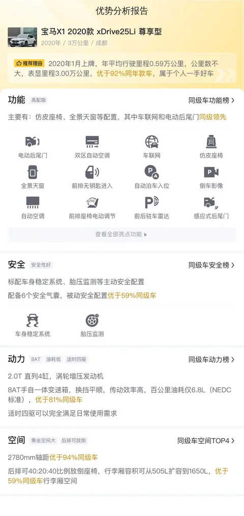 当前市场上,这款宝马X1 2020款 xDrive25Li 尊享型的二手车价格大约在15.2万至18.71万元之间。根据估算,该车六年的平均用车成本约为14186元/年,具体支出包括油费、保养费、保险费等。