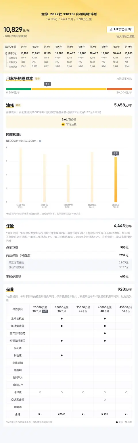 购车之后的使用成本也是每个车主必须考虑的实际情况。根据估算,这辆途观L的年均综合使用成本大约为11179元,这一数字与多数同级别车相比,处于较高水准,这一点需各位购车者在选购时也要纳入考虑范畴。