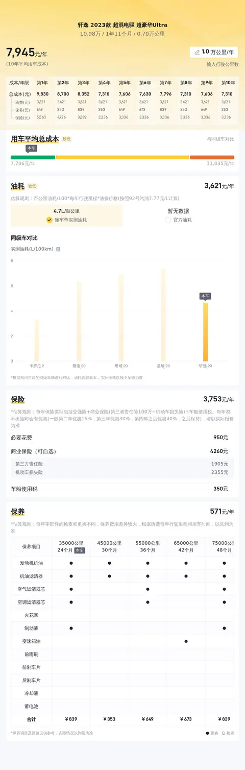 轩逸 2023款 超混电驱 超豪华Ultra的10年平均用车成本是8520元/年,而同级车的最低是5610元/年,最高是8520元/年,所以它的用车成本只在正常范围内,不占优势。