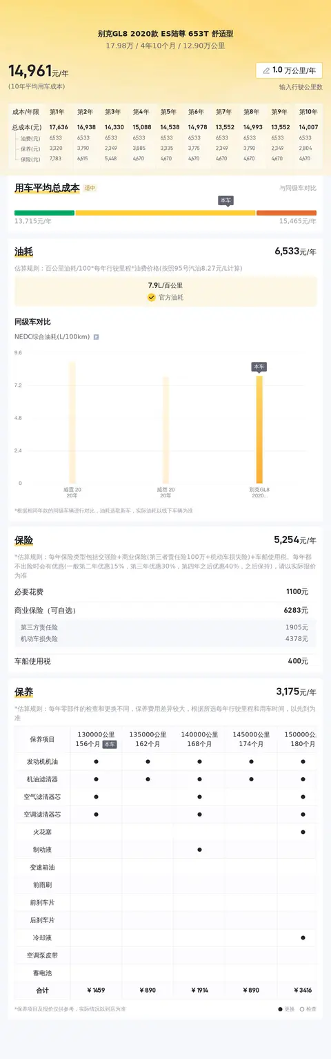 按照懂车帝的估算,这辆车的年均综合用车成本大概在每年1.5万元左右。这项花销是跟车主的实际用车场景和使用强度有直接变化的。
