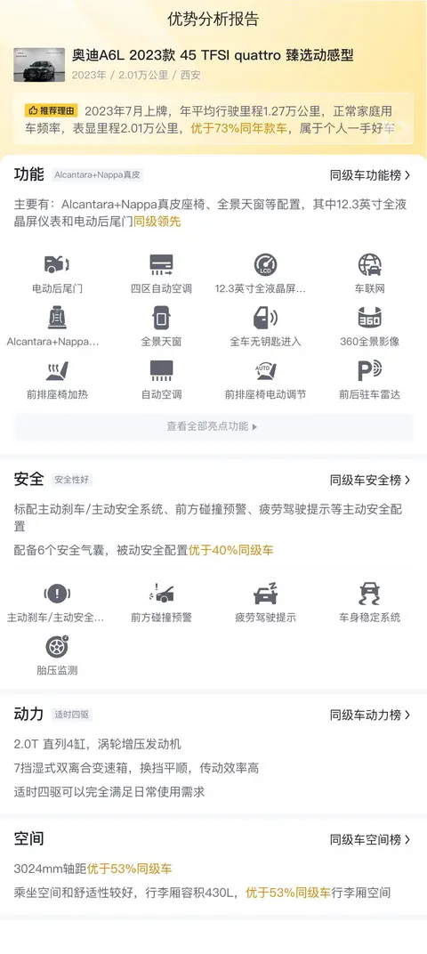 综上所述,这辆奥迪A6L 2023款 45 TFSI quattro 臻选动感型二手车在动力性能、内饰用料、舒适配置及空间表现等方面均展现出不俗的实力。其合理的售价和较低的养车成本,使得它成为追求豪华品牌且预算有限的消费者的理想选择。然而,由于该车辆没有提供检测报告,潜在买家在做出购买决策之前,建议亲自到店查看车辆实际情况,确保车况符合个人期望。