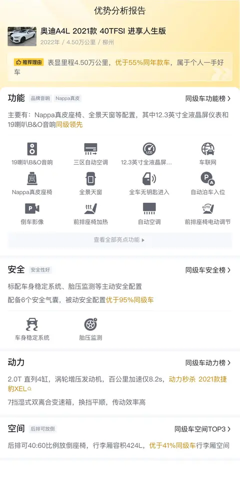综上所述,这辆奥迪A4L 2021款 40TFSI 进享人生版是一辆集豪华、科技和性能于一身的二手车。它不仅拥有出色的外观和内饰设计,还配备了丰富的配置和强大的动力系统。在同级别车型中具有较高的性价比和竞争力。然而,需要注意的是,车辆的实际状况和价格需要结合具体情况和市场需求来进行评估。建议消费者在购买前进行充分的了解和比较,选择最适合自己的车型和车况。