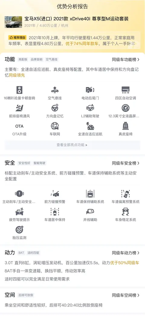 从功能配置方面来看,这辆车主要有全速自适应巡航、真皮座椅等配置,其中车道居中保持和方向盘记忆同级领先。从动力方面来看,3.0T 直列6缸,涡轮增压发动机,百公里加速仅5.5s,动力优于50%同级车,8AT手自一体变速箱,换挡平顺,传动效率高,适时四驱可以完全满足日常使用需求。从空间方面来看,乘坐空间和舒适性较好,后排可40:20:40比例放倒座椅。
