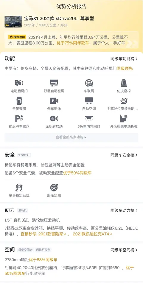 宝马X1(图片|配置|询价)作为宝马品牌旗下的紧凑型SUV,首次亮相是在2009年的法兰克福车展。作为宝马X家族较晚加入的成员,宝马X1在保留宝马品牌驾驶乐趣和操控性能的同时,更加注重日常实用性和舒适性。2021款sDrive20Li尊享型作为宝马X1家族的一员,延续了宝马品牌的优秀传统,并在多方面进行了升级和优化。动力配置和综合油耗是宝马X1 2021款 sDrive20Li 尊享型的重要特点之一。它搭载了宝马B系列1.5T涡轮增压发动机,具有出色的的动力输出和平顺的加速性能。传动系统匹配的是7挡双离合变速箱,这款变速箱换挡平顺迅速,能够高效传递发动机动力,同时在日常驾驶中提供良好的燃油经济性。宝马X1 2021款 sDrive20Li 尊享型在配置上也非常丰富,包括全景天窗、电动后备厢、多功能方向盘、定速巡航、倒车影像等,这些配置不仅提升了使用的便利性,也增加了驾驶的乐趣和舒适性。宝马X1 2021款 sDrive20Li 尊享型凭借其出色的动力性能、豪华的配置和合理的价格定位,在市场上赢得了消费者的青睐和好评。它在保持宝马品牌一贯的高品质和卓越性能的同时,也展现出了宝马X1作为一款紧凑型SUV的独特魅力和个性。今天给大家带来的这款宝马X1 2021款 sDrive20Li 尊享型,上牌日期2021年4月,车源地跟上牌地均为郑州,过户次数0次,表显里程3.6万公里,新车指导价29.88万,二手车报价11.68万。