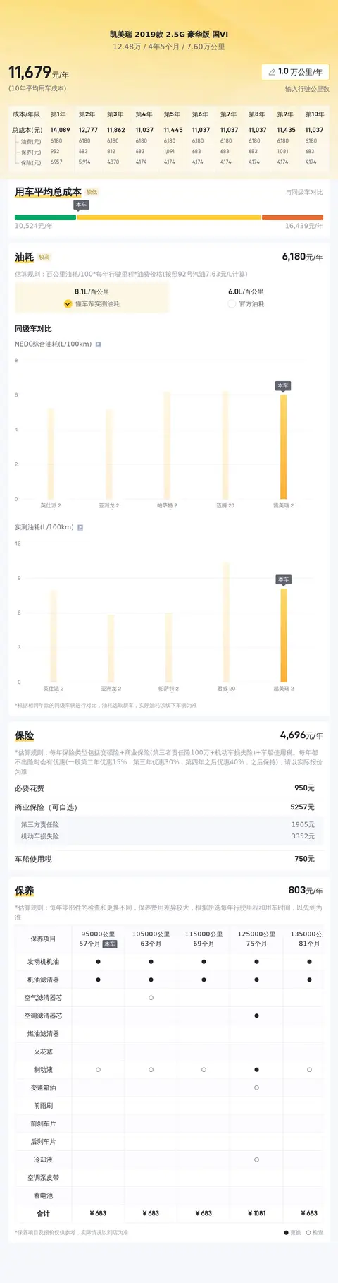 经过懂车帝综合分析,这辆车的10年平均用车成本大概是12,345元/年,这个用车成本包含燃油费、保养费、保险费等用车所有开支,其中保险和保养费用根据车龄、里程是有波动的,这点大家要明确。好了,以上就是这辆车的全部介绍了。