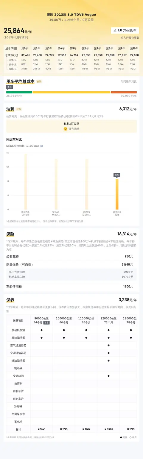 购车不仅要考虑购车成本,也要计算日常用车成本。下面我们就来看看这辆二手揽胜 2013款 3.0 TDV6 Vogue的日常用车成本吧。根据估算,这辆车的年均综合用车成本约2.6万元左右,这项花销具体金额跟车主的实际用车场景和使用强度有直接关系。