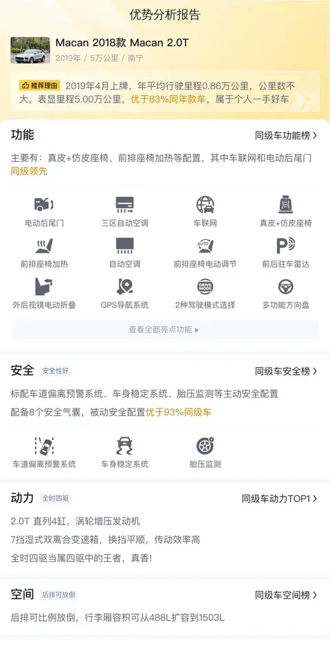 接下来,让我们深入了解这辆二手保时捷Macan的具体情况。该车具体版本为Macan 2018款 Macan 2.0T,上牌地车源地均为南宁,上牌日期2019年4月,表显里程5万公里,银灰色车身,国VI排放标准,未过户。新车指导价54.5万,现卖家报价26.38万。