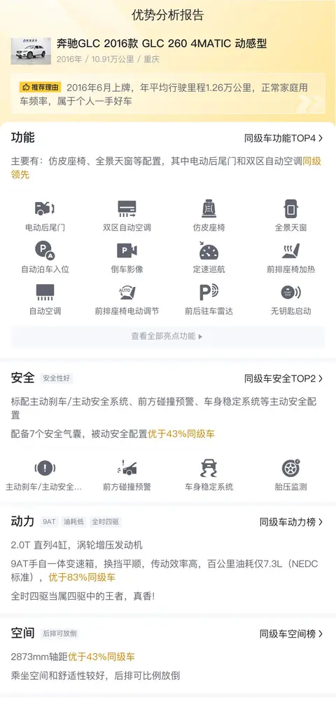 该车具体版本为奔驰GLC 2016款 GLC 260 4MATIC 动感型,上牌日期2016年6月,表显里程10.91万公里,重庆牌照,新车指导价42.80万,目前二手车报价13.90万,该车目前没有过户记录。按照懂车帝的车况分级标准,这辆车的分级是精品。