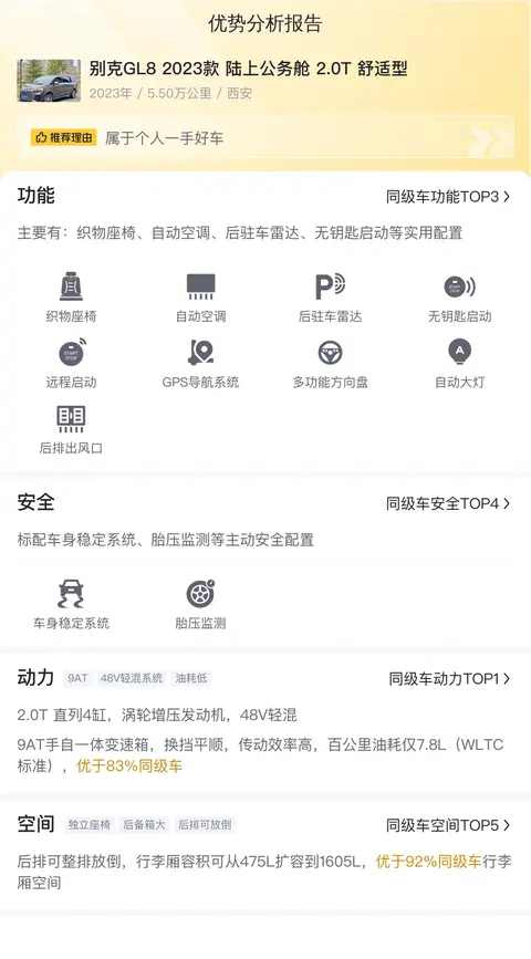 别克GL8(图片|配置|询价) 2023款 陆上公务舱 2.0T 舒适型是一款高档商务车,以其卓越的性能和合理的价格赢得了市场的认可。它于2023年2月1日改款上市,新增360度全景影像功能,指导价相比改款前上涨1000元。这款车凭借其豪华舒适的乘坐体验、出色的动力性能和全面的安全配置,在同级别车型中占据了重要地位。其受众人群广泛,既包括追求高品质出行体验的商务人士,也涵盖了注重家庭出行舒适性的消费者。
