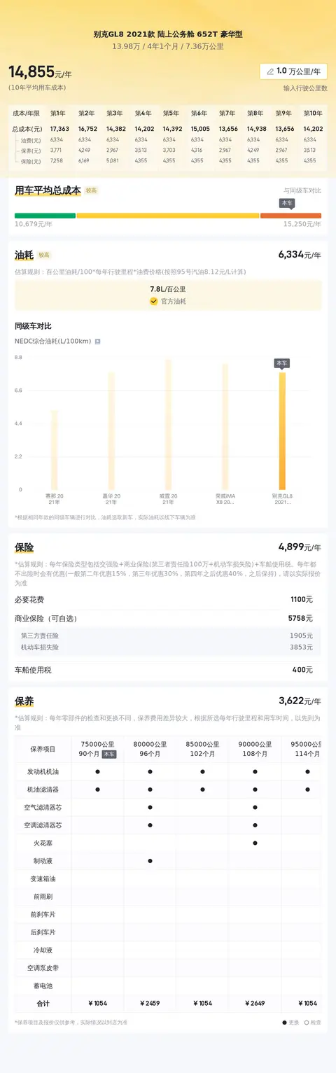 在用车成本方面,根据估算,这辆车的年均综合用车成本约为1.5万元左右。这项费用不包含贷款产生的利息以及停车费、洗车费、交通罚款等费用。用车成本因人而异,每个人的用车场景和用车强度都不同,所以真实用车成本也会有所差异。