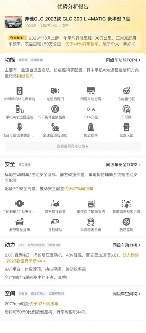 买二手车,它的配置师管很重要,毕竟可以最直观看到车辆的配置都有哪些。这辆奔驰GLC 2023款 GLC 300 L 4MATIC 豪华型 7座配备了全速自适应巡航、自动泊车入位、3种驾驶模式可选、仿皮座椅等配置,其中手机App远程控制和方向盘记忆同级领先。