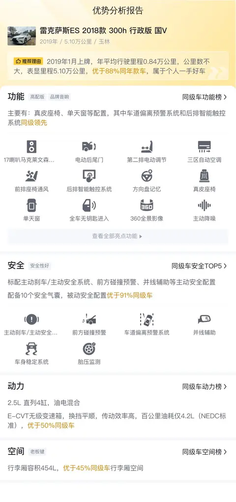 先让我们来了解一下这辆二手雷克萨斯ES的基本情况,该车具体版本是2018款 300h 行政版 国V,上牌日期为2019年1月,上牌地和车源地均为玉林,表显里程为5.1万公里,车身颜色为白色,新车指导价46.8万,二手车报价29.98万,过户次数0次。