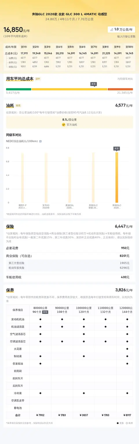 在用车成本方面,根据估算,这辆车的年均综合用车成本约17344元,这项花销是跟车主的实际用车场景和使用强度有直接变化的。