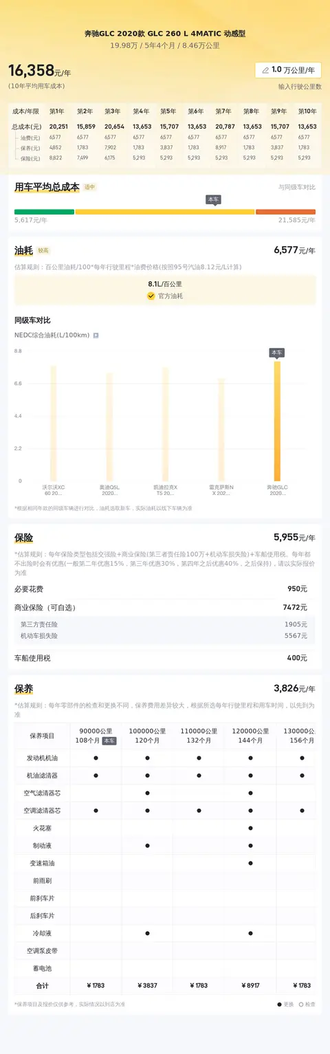 根据估算,这辆奔驰GLC 2020款 GLC 260 L 4MATIC 动感型的用车成本不算低,因为同级车的最低用车成本是5467元/年,最高是21324元/年,而这辆车是15683元/年,所以偏高。