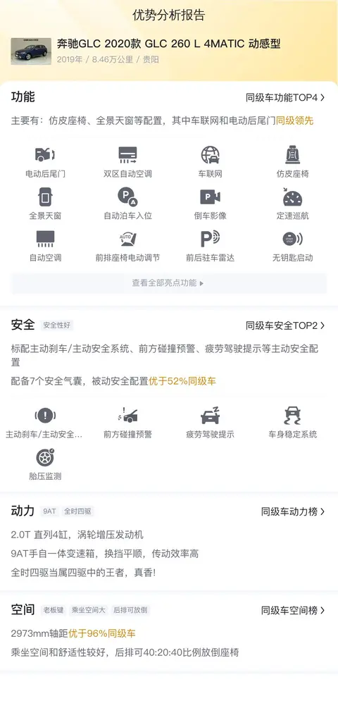 这辆奔驰GLC 2020款 GLC 260 L 4MATIC 动感型的主要受众还是冲着奔驰这个品牌去的,当然本身性能确实不错,外观霸气,内部豪华,驾驶感也很好。只不过作为二手车,确实应该着重考虑下保养费用,以及豪车常见的烧机油等问题,都要在买车前考虑清楚,别出现了后悔的情况。