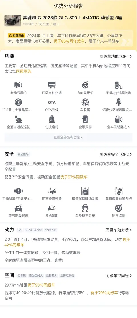 综上所述,这辆二手奔驰GLC 2023款 GLC 300 L 4MATIC 动感型 5座在车况、配置、安全、动力、操控、空间、舒适性等方面均表现出色,是一款值得推荐的豪华SUV。在车况部分,除了外观、内饰功能的检测,更多买家关注的是这辆车是否为“三非”车辆,三非就是指非重大事故、非火烧、非水泡。因为事故车、泡水车、火烧车都存在较大的安全隐患。不过您放心,这辆车已经通过了事故检测、火烧检测和泡水检测,可以确定它非重大事故车、非火烧车、非泡水车。在配置和安全方面,该车搭载了多项领先配置和主动安全系统,为驾驶者提供了极致的驾驶体验和全方位的安全保护。在动力和操控方面,车辆搭载的2.0T发动机和全时四驱系统使得其在各种路况下都能保持出色的性能。在车身尺寸和空间方面,宽敞舒适的乘坐空间和行李厢容积能满足家庭出行的需求。在市场行情和用车成本方面,该车售价区间合理,但用车成本较高。总的来说,如果您正在寻找一款豪华SUV,这辆二手奔驰GLC无疑是一个值得考虑的选择。在做出购买决策之前,建议您亲自到店查看车辆实际情况,体验车辆性能,确保自己对车辆完全满意。