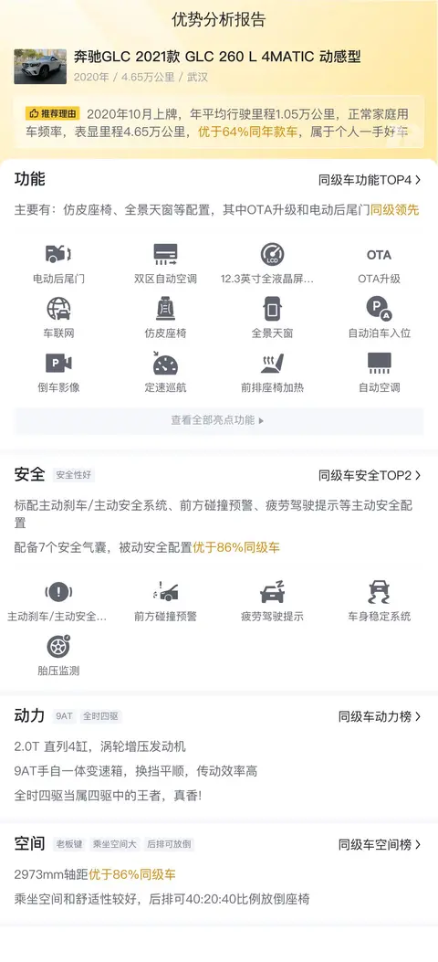 在二手车市场,每辆车的车况都不同,影响着其价值。这辆车的里程少于同年款车型均值,车龄适中,且未有过过户记录,颜色也较受欢迎,这些因素共同作用于它的定价。目前,该车报价为20.59万元,预计两年后仍能保持约14万元的售价,展现了较好的保值能力。总的来说,这是一辆性价比高、值得考虑的二手奔驰GLC。