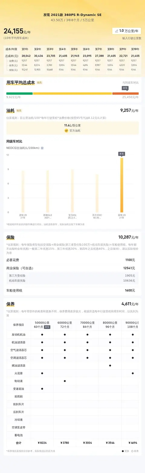 在市场行情部分,这款车当前的市场价格在36.22万至44.12万之间。具体的价格因车辆的车龄、里程数、所在地以及保养情况等不同情况而定。在用车成本方面,根据估算,该车的年均综合用车成本约为2.4万元。需要注意的是,实际费用支出可能会根据用车强度和环境等因素有所变动。