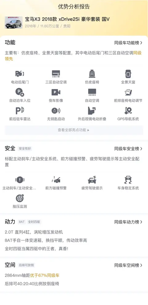 在查阅二手车市场数据后,我们发现该车的售价具有较强的竞争力。考虑到其车况良好且属于豪华品牌车型,此价格为潜在买家提供了较高的性价比。在保值率方面,宝马X3一直保持着相对稳定的水平。这意味着即使在未来车主打算再次出售此车辆时,也能获得较为可观的回报。综上所述,这款宝马 X3 2018 款 xDrive25i 豪华套装是一款集豪华、性能、舒适于一体的出色车型。其合理的售价和稳定的保值率使其成为二手车市场上的热门选择。