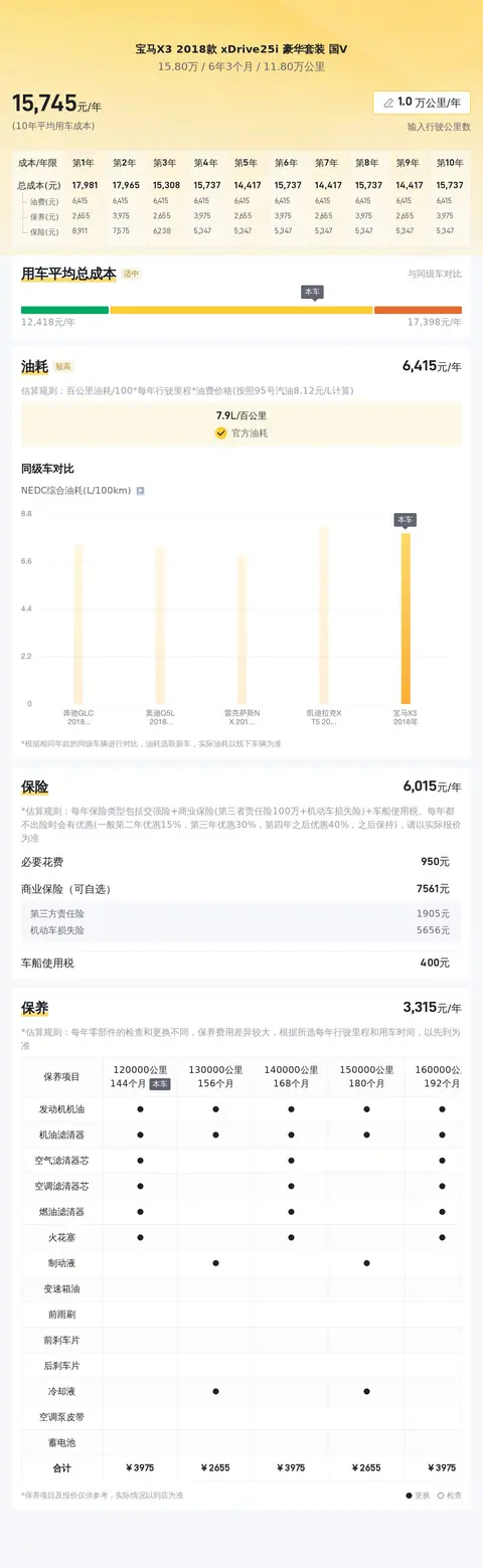 关于用车成本,根据估算,这辆二手宝马X3的年均综合用车成本在1.6万元左右。需要注意的是,实际费用可能会因个人驾驶习惯、地区差异等因素而有所不同。在购买二手车时,除了考虑购车成本外,还需预留一部分资金用于日常维护和潜在的维修支出。虽然二手车通常价格更为优惠,但车辆的保养状况和潜在问题可能增加额外的开支。因此,建议在购买前进行全面的车辆检查,并咨询专业人士或经验丰富的车主以获取更准确的用车成本估算。