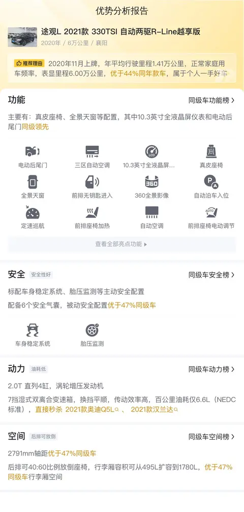 途观L 2021款 330TSI 自动两驱R-Line越享版作为一款中型SUV,在动力性能、空间表现、舒适配置等方面都表现出色,能够满足家庭出行的各种需求。虽然存在一些普遍性问题,但并不影响正常使用。这款车型的二手车市场价格较为合理,对于想要购买一款高品质中型SUV的消费者来说,途观L 2021款 330TSI 自动两驱R-Line越享版是一个不错的选择。
