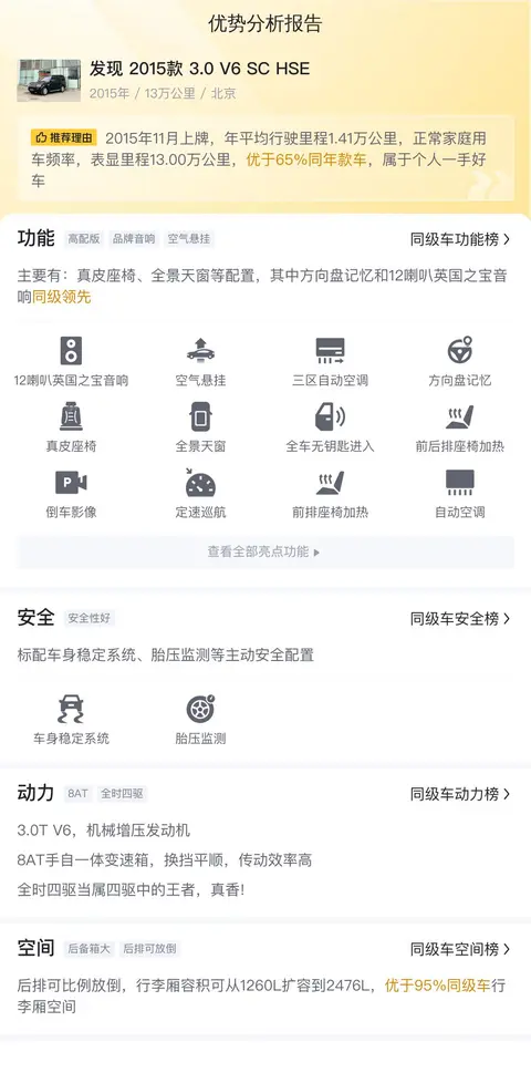发现 2015款 3.0 V6 SC HSE 版本在动力、舒适性和科技感方面的出色表现,使其在豪华SUV市场中独树一帜。其均衡的性能与优雅的设计,不仅满足了日常驾驶的需求,更在不经意间彰显了车主的不凡品味。作为一款二手车,它同样具备较高的性价比,对于追求品质与性价比并存的消费者来说,发现 2015款 3.0 V6 SC HSE无疑是一个值得考虑的选择。