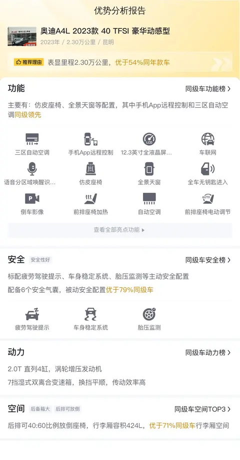 接下来,我们聊聊这台车的配置部分。买二手车,配置要实用。这台车配有全车无钥匙进入和启动、倒车影像、前后驻车雷达等多项实用配置,其中语音识别控制系统和单色车内氛围灯更是增添了驾驶的乐趣。至于动力方面,2.0T的发动机和7挡湿式双离合变速箱的搭配,既能满足日常驾驶的需求,又能在需要的时候提供足够的加速能力。悬挂方面,多连杆式独立悬挂保证了车辆的操控性和乘坐的舒适性。总之,这台车在配置、动力和悬挂等方面的表现都不错,无论是日常驾驶还是长途旅行,都能为驾驶者和乘客带来良好的驾驶和乘坐体验。