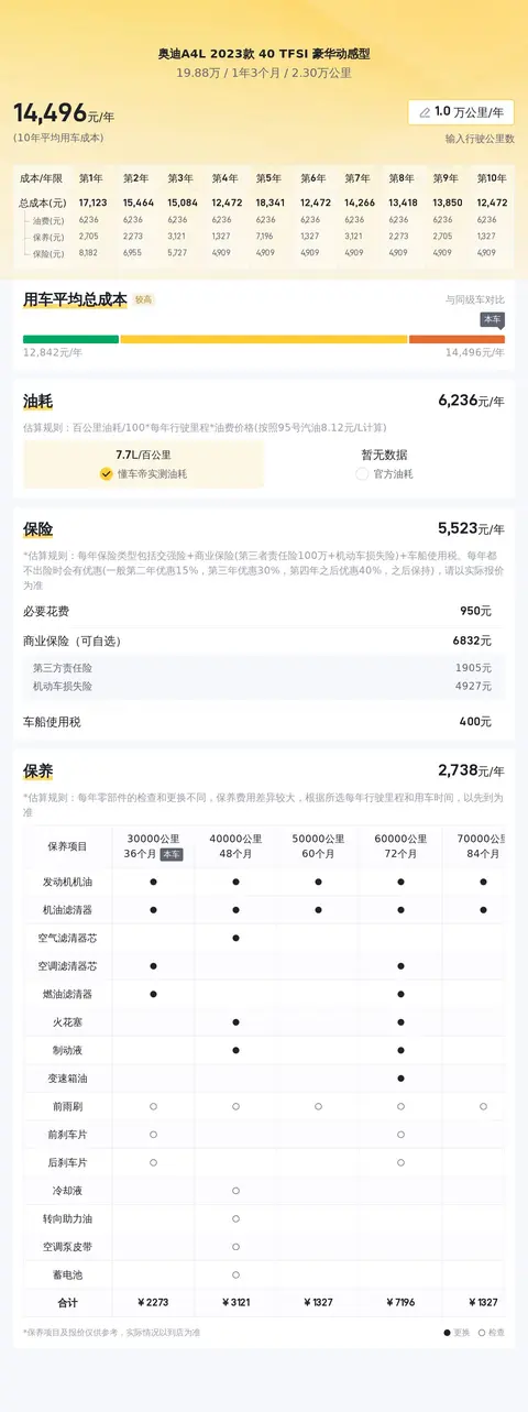 除了价格,咱们再聊聊这款车的使用成本。根据懂车帝平台的大数据分析,奥迪 A4L 的平均用车成本大概在 13620 元/年,当然这个跟每个人的用车习惯、用车半径和行驶里程都有直接关系。保险费用方面,预估每年约 5556元,保养费用每年约 2388元。值得一提的是,这款车的百公里油耗约为 6.9L,也属于比较省油的车型,对于家庭用车来说,这个油耗表现还是相当不错的!