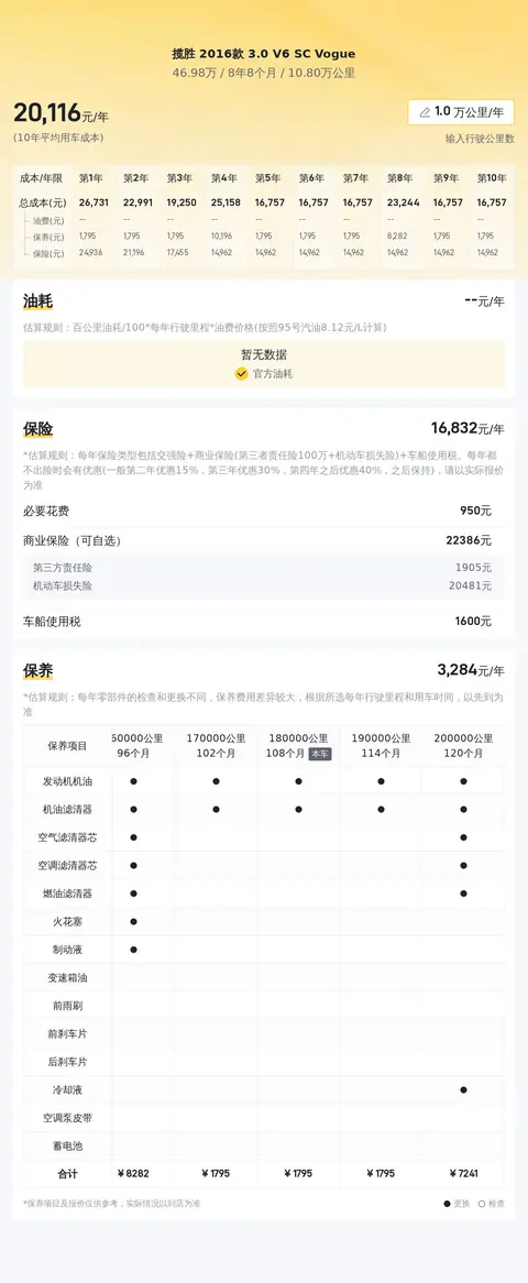 关于这款车的用车成本,我们统计了一些数据,供大家参考。这辆车的年度商业保险约12463元/年,保养费用大约4383元/年,燃油费用约11031元/年,其他费用根据个人情况而定,以上数据仅供参考,实际费用可能因使用频率、驾驶习惯等因素有所不同。