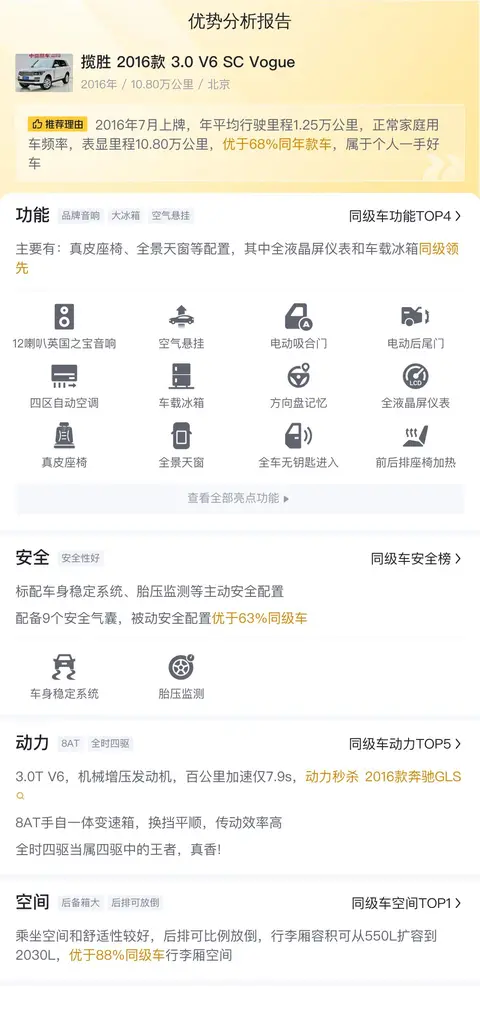 在功能配置部分,这辆车配有真皮座椅、全景天窗等配置,其中全液晶屏仪表和车载冰箱同级领先。在动力性能上,搭载3.0T V6,机械增压发动机,百公里加速仅7.9s,动力秒杀2016款奔驰GLS,8AT手自一体变速箱,换挡平顺,传动效率高,全时四驱当属四驱中的王者,真香!在空间部分,乘坐空间和舒适性较好,后排可比例放倒,行李厢容积可从550L扩容到2030L,优于88%同级车行李厢空间。