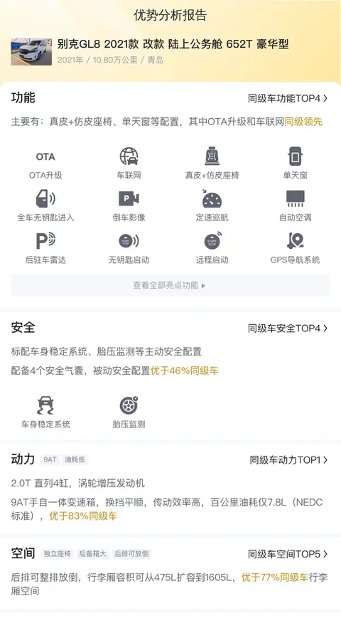 别克GL8(图片|配置|询价) 2021款改款陆上公务舱652T豪华型是一款7座MPV车型,搭载2.0T发动机,匹配9挡手自一体变速箱,最大功率237马力,最大扭矩350牛·米,NEDC综合油耗7.8L/100km。车身尺寸5238x1878x1800mm,轴距3088mm,行李舱容积475-1605L。配置包括无钥匙进入、远程启动、定速巡航、倒车影像、上坡辅助等。2021年1月上牌,行驶里程10.80万公里,新车指导价25.89万,现价12.88万,过户次数1次。接下来,我们将为您详细分析这辆车的综合情况。