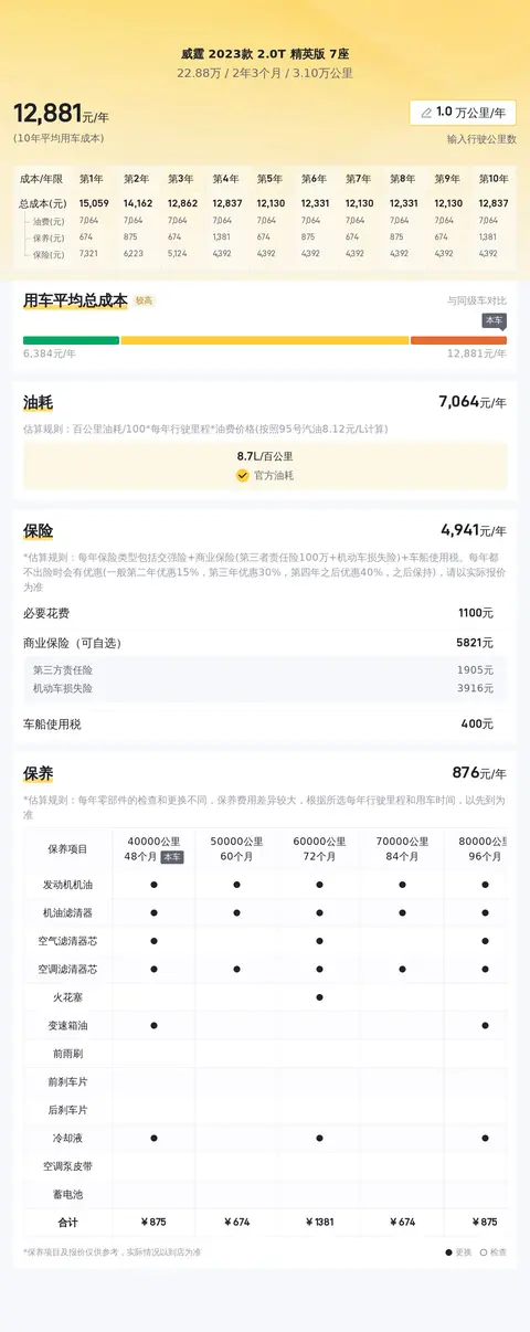 油耗成本:按照官方数据,这款车的百公里油耗为8.7L左右。假设每年行驶2万公里,当前油价为8.02元/L,那么每年的油费支出约为14,448元。