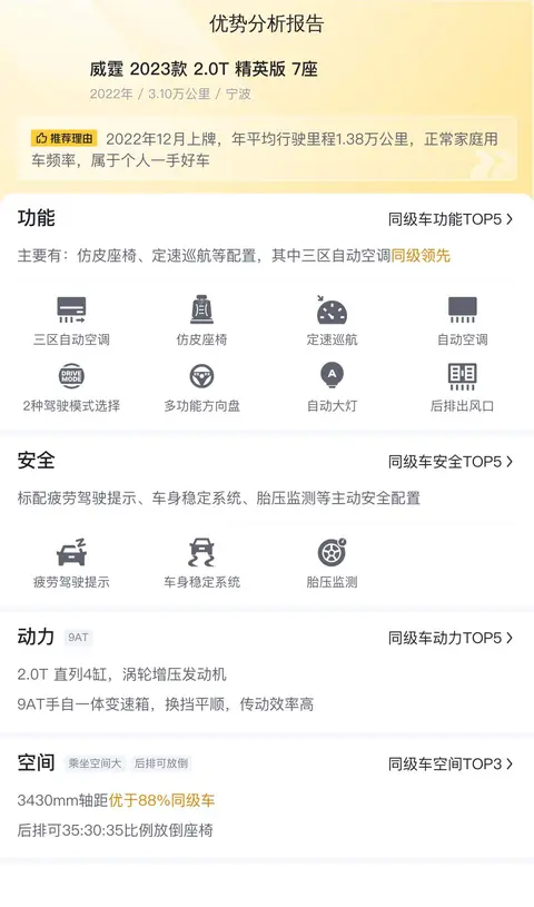 综上所述的新车含税价、用车成本、市场行情、优势分析、同款比价等数据仅供参考。在配置部分,因为二手车非标品,车辆可能会存在配置改装的情况,具体车况信息需要线下结合车辆实际情况进行综合参考。