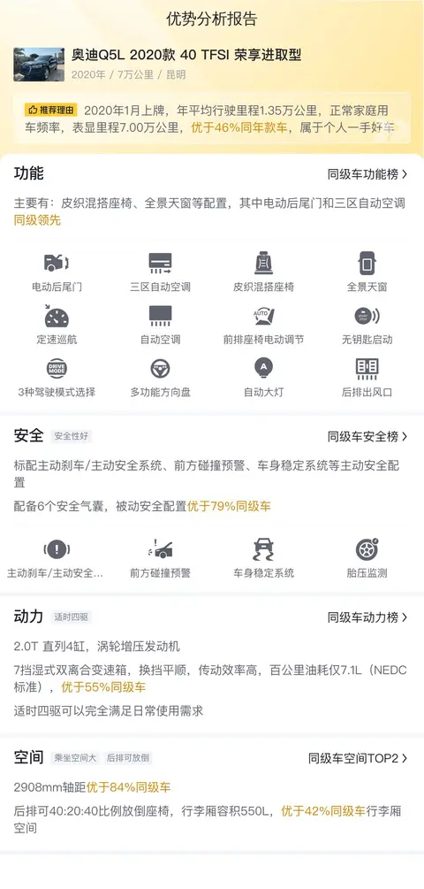 奥迪Q5L 2020款 40 TFSI 荣享进取型不仅是一款卓越的豪华SUV,更是一款能够满足消费者多元化需求的理想座驾。它凭借自身的实力和魅力,将继续书写奥迪Q5家族的辉煌篇章。那么接下来让我们看看这辆二手奥迪Q5L表现如何。