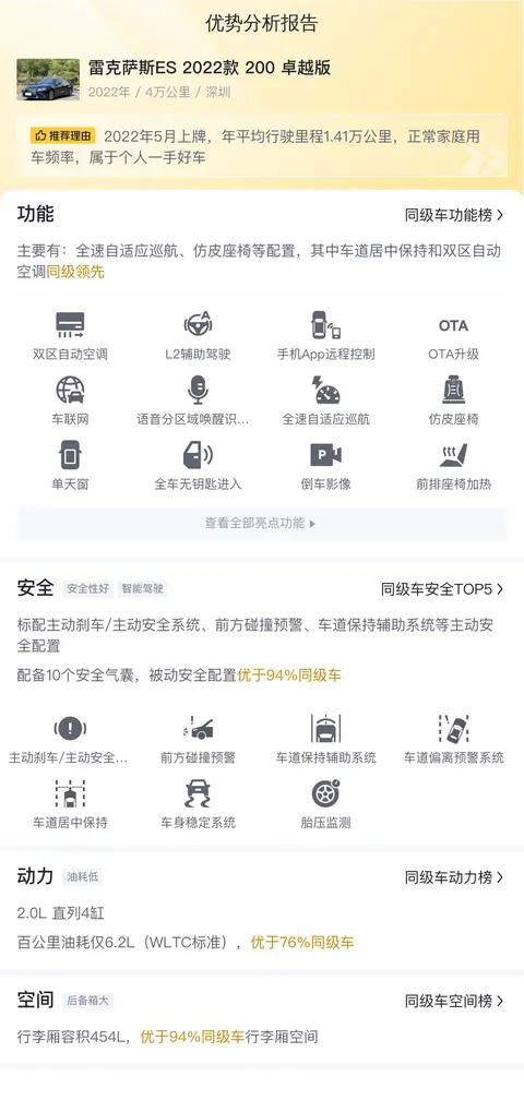 在购买二手车时,车况始终是买家最为关注的因素。对于这辆雷克萨斯ES 2022款 200 卓越版,我们建议您亲自到现场查看车辆实际情况,确保车况符合您的期望。此外,您可以借助懂车帝平台的大数据分析,了解市场行情和用车成本,为您的购车决策提供参考。总的来说,如果车况良好,这款雷克萨斯ES 2022款 200 卓越版作为一款豪华轿车,在性能、配置、舒适性和安全性方面都表现出色,是一款值得考虑的二手车选择。