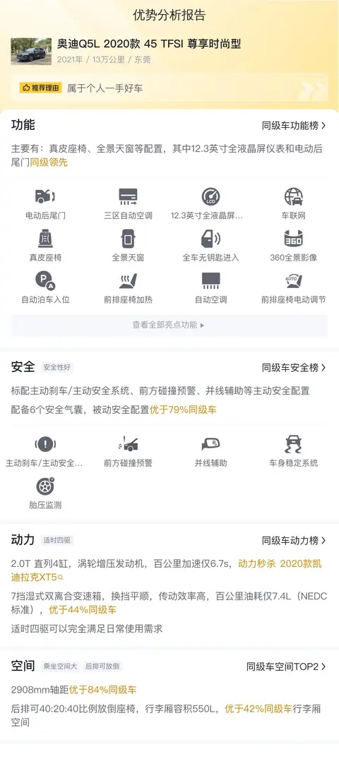 综上所述,这辆二手奥迪Q5L 2020款 45 TFSI 尊享时尚型车况良好,内外观均无大碍,车辆的配置丰富,且车辆售价符合市场行情,存有一定性价比,用车成本适中,且奥迪品牌和Q5L车型在市场保有量大,后续车辆再出售时的残值也会相对更高一些。如果您正在寻找一辆二手豪华SUV,那么这辆奥迪Q5L是一个值得考虑的选择。