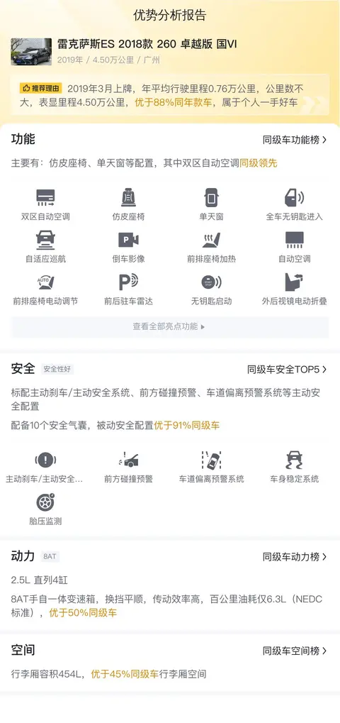 在同级车对比部分,雷克萨斯ES在舒适性、动力、操控性方面表现的比较优秀,同时在油耗经济性方面也保持着良好的水平。当然,每一款车都有自己的优缺点,这个是要结合整车具体情况进行综合考量的。