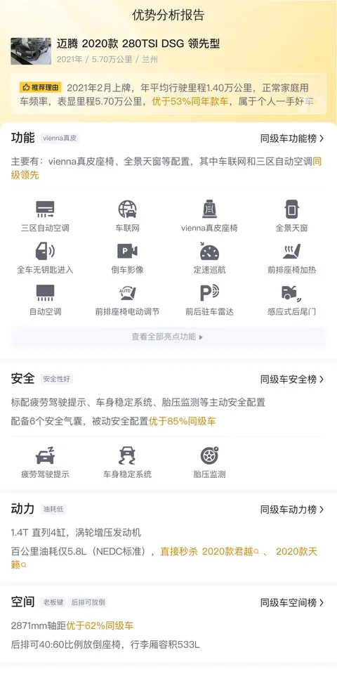 综上所述,迈腾 2020款 280TSI DSG 领先型在内饰、空间、动力、操控、舒适性、安全性、性价比、以及保值率等方面的表现均十分出色,是一款值得推荐的B级轿车,但是,由于该车没有检测报告,所以具体的情况还需要线下看实车确认哟,另外,买车是一件需要谨慎考虑的决策,希望你能权衡利弊,做出最适合自己的选择,如果可以的话,真钱试驾一下是最好的啦~最后,祝你可以买到心仪的汽车哟~