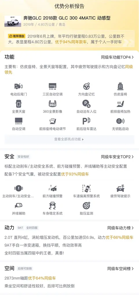综上所述,这辆二手奔驰GLC 2018款 GLC 300 4MATIC 动感型在里程数、售价、配置、动力性能和驾乘舒适性等方面均表现出色,是一辆性价比较高的豪华SUV。然而,其较高的用车成本和维修保养成本可能是潜在车主需要考虑的因素。在购买前,建议您对该车辆进行详细的检查和评估,以确保其符合您的需求和预算。