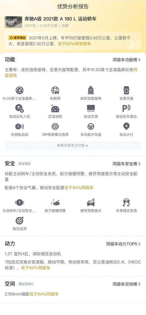 综上所述,奔驰A级 2021款 A 180 L 运动轿车凭借其卓越的品质、先进的技术和合理的售价,成为了二手车市场中的璀璨明星。无论您是追求驾驶乐趣的爱车人士,还是需要一辆日常代步车的城市居民,这款车都能满足您的需求并带给您意想不到的惊喜。如果您正在寻找一辆性价比高、品质可靠的二手车,那么这款奔驰A级无疑是一个值得考虑的选择。