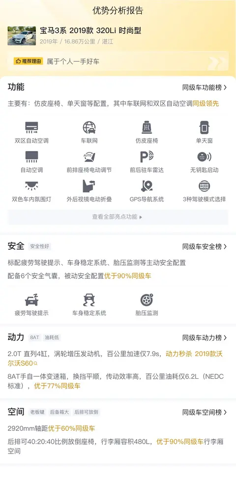 2019款的车,不到十万的价格,肯定不能追求太多配置,但也有网友表示,这辆车的配置能满足基本需求。宝马3系 2019款 320Li 时尚型配备了仿皮座椅、单天窗等配置,其中车联网和双区自动空调同级领先。在安全配置上,标配车身稳定系统、胎压监测等主动安全配置,配备6个安全气囊,被动安全配置优于90%同级车。