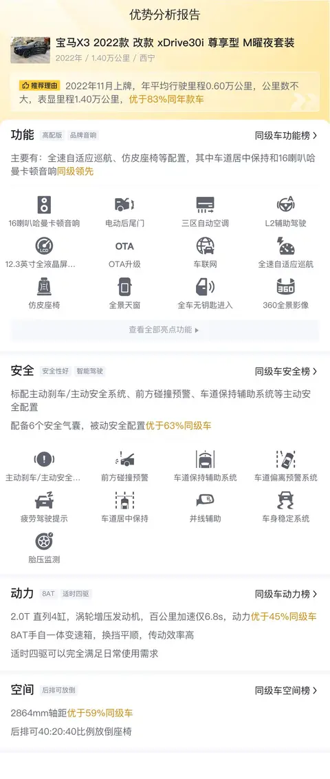 宝马X3(图片|配置|询价)作为宝马旗下的中型SUV,以其出色的操控性能和先进的技术配置赢得了市场的广泛认可。自2003年第一代车型E83问世以来,宝马X3经历了多代更迭,每一代都承载着宝马xDrive智能全轮驱动系统的卓越性能。2022款宝马X3延续了这一传统,并在智能科技和驾驶体验上进一步提升,为消费者带来了更加出色的驾乘感受。今天给大家介绍的这款车,宝马X3 2022款 改款 xDrive30i 尊享型 M曜夜套装,首次进入车主视线是在2019年的法兰克福国际车展,随后于2020年在国内正式上市。该车搭载了2.0T高功率发动机,提供了强劲的动力输出,同时在外观和内饰上也进行了多项升级,增强了整车的豪华感和运动气息。这辆宝马X3 2022款 改款 xDrive30i 尊享型 M曜夜套装,车源地是西宁,上牌地是西宁,上牌日期2022年11月,表显里程1.4万公里,新车指导价47.98万,二手车报价31.6万,过户次数1次。