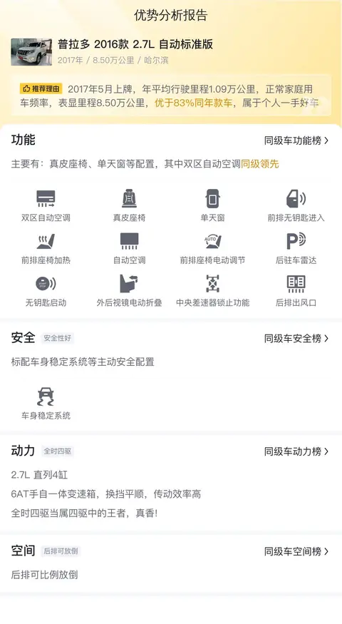 买二手车,车况永远是放在第一位的,这辆普拉多虽然外观有不少的瑕疵项,但都是车身覆盖件,并不影响车身安全结构,而且定价也不高,和同年份的普拉多相比,价格很有优势,毕竟这么少的里程,这么新的车况,还是很少见的。普拉多有不错的越野性能,也有相对舒适的都市文明生活体验,买这么一辆二手车,花一半的新车价格,享受一样的品质,也是个不错的选择。