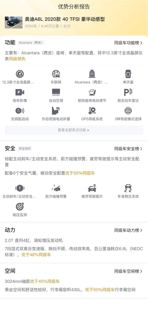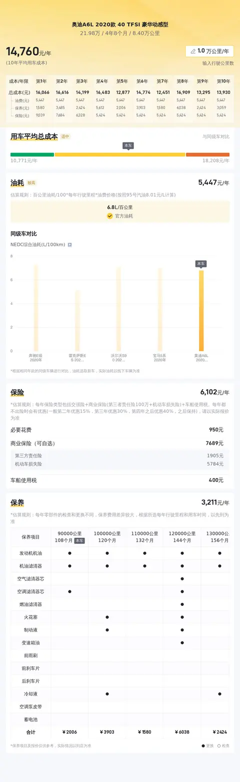 关于用车成本部分,根据懂车帝官方的大数据分析,奥迪A6L 2020款 40 TFSI豪华动感型的10年平均用车成本约为15,485元/年,这一数据处于行业内的合理范围之内,是一个大多数消费者都可以接受的价格。