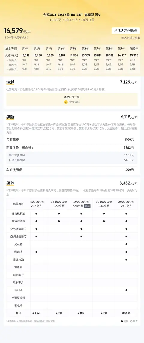 养车成本方面,该车官方公布的百公里油耗为8.9升,按每年行驶一万公里里程计算,燃油费用约为7472元,年度商业保险约6145元,每年保养费用约3525元,平均年度用车总成本约17142元,养车成本处于同类型车中等偏下水平,经济性还是不错的。上述数据仅供参考,实际用车成本因用车场景及行驶里程而有所不同。