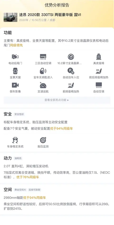 综上所述的新车含税价、用车成本、市场行情、优势分析、同款比价等数据仅供参考。在配置部分,因为二手车非标品,车辆可能会存在配置改装的情况,具体车况信息需要线下结合车辆实际情况进行综合参考。