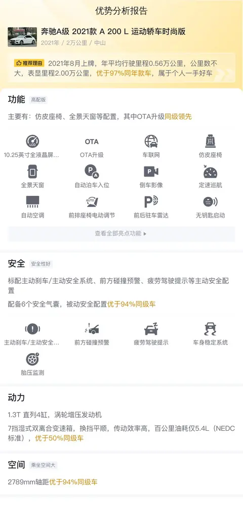消费者买二手车迟迟没有下手的原因,无非是对这款车不了解,不敢买,而我们这款奔驰A级 2021款 A 200 L 运动轿车时尚版经过懂车帝300多项检测以后,已经有了完整的全车深度检测报告。